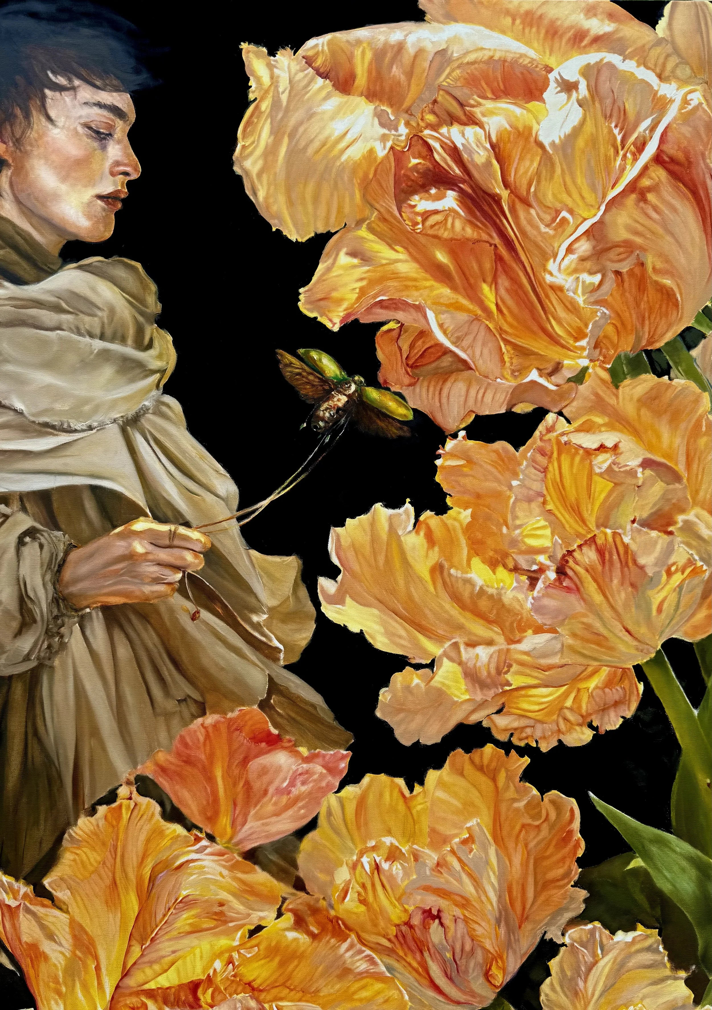 This painting approaches transhumanism not as a fantasy of perfected form, but as a problem of visibility. Rather than presenting an idealized future body, the work stages a threshold: beauty appears mediated, partitioned, and selectively shielded, held behind structures that regulate access and suppress noise. The human figures are filtered rather than transformed. Their faces are intersected by apparatuses, grids, and botanical intrusions that register time, contingency, and biological excess. What emerges is a quiet inversion of the transhuman promise. Enhancement does not amplify beauty; it insulates it. In doing so, the work asks whether beauty can remain perceptible once it is severed from the very disturbances such as error, growth, decay, interruption that historically made it meaningful. The painting poses a final question: in a future optimized for proficiency, standardized beauty, and control, do we risk reducing beauty by restricting the unplanned to enter the frame?