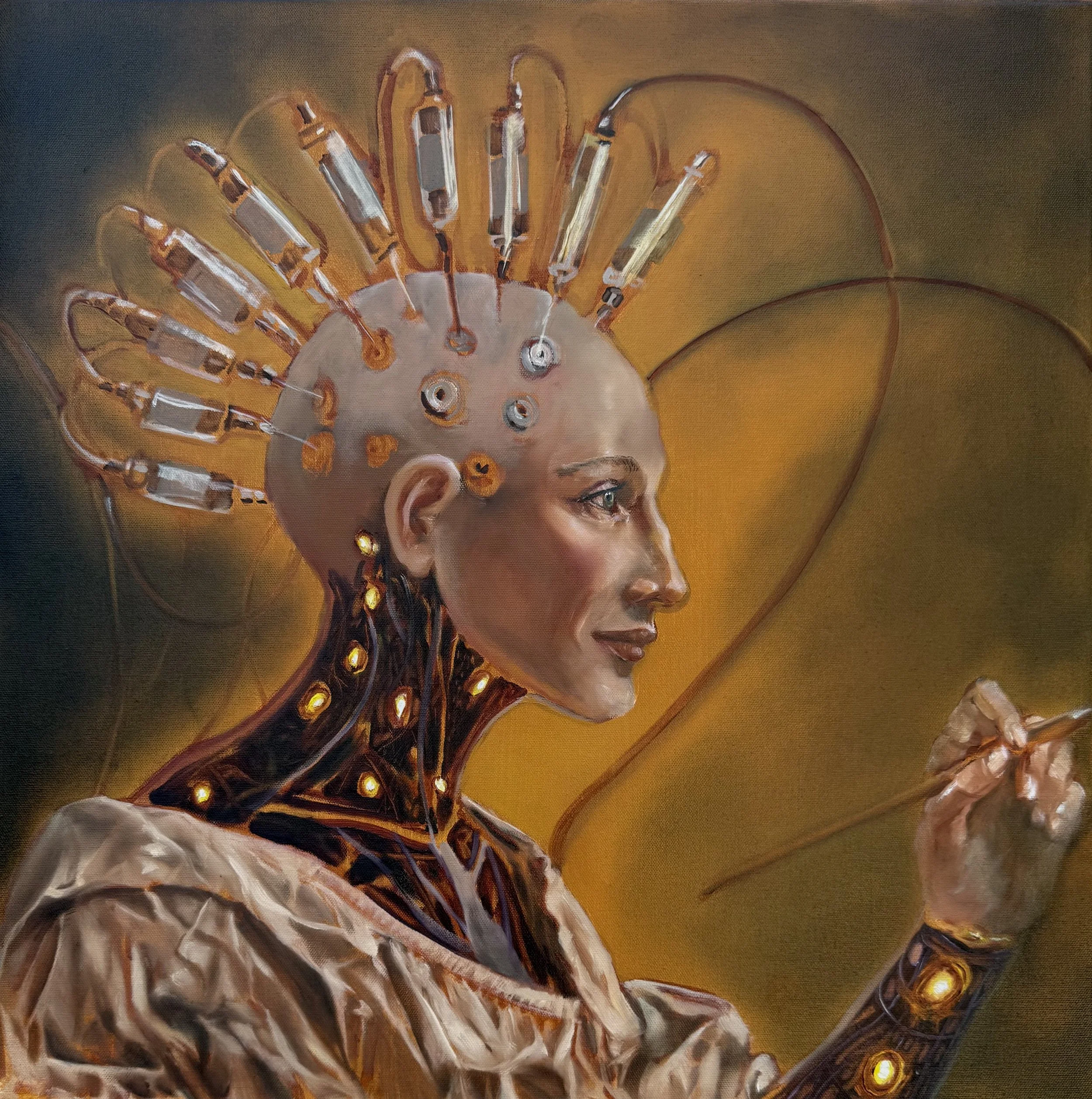 This painting reimagines the myth of Pandora’s Box through the lens of transhumanism and artificial intelligence. The central figure—a hybrid of human and machine—represents the transformation of humanity as AI becomes deeply embedded in our lives. Her bio-techno body reflects both the elegance and unpredictability of AI’s emergence. Insects surround her: symbols of natural intelligence, fragility, and swarm dynamics—echoing the potential beauty and danger of rapid AI proliferation. The golden box behind her evokes ancient myth and modern uncertainty.